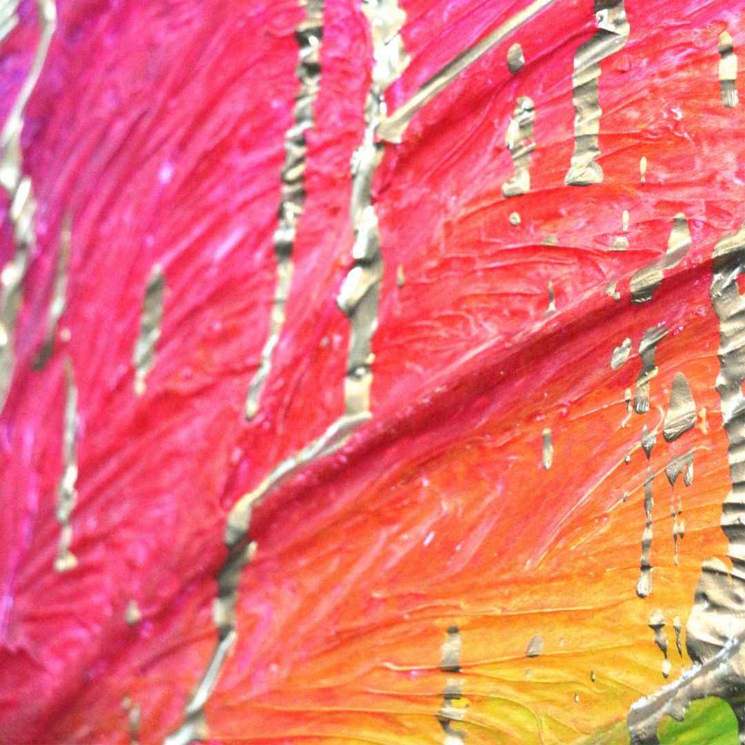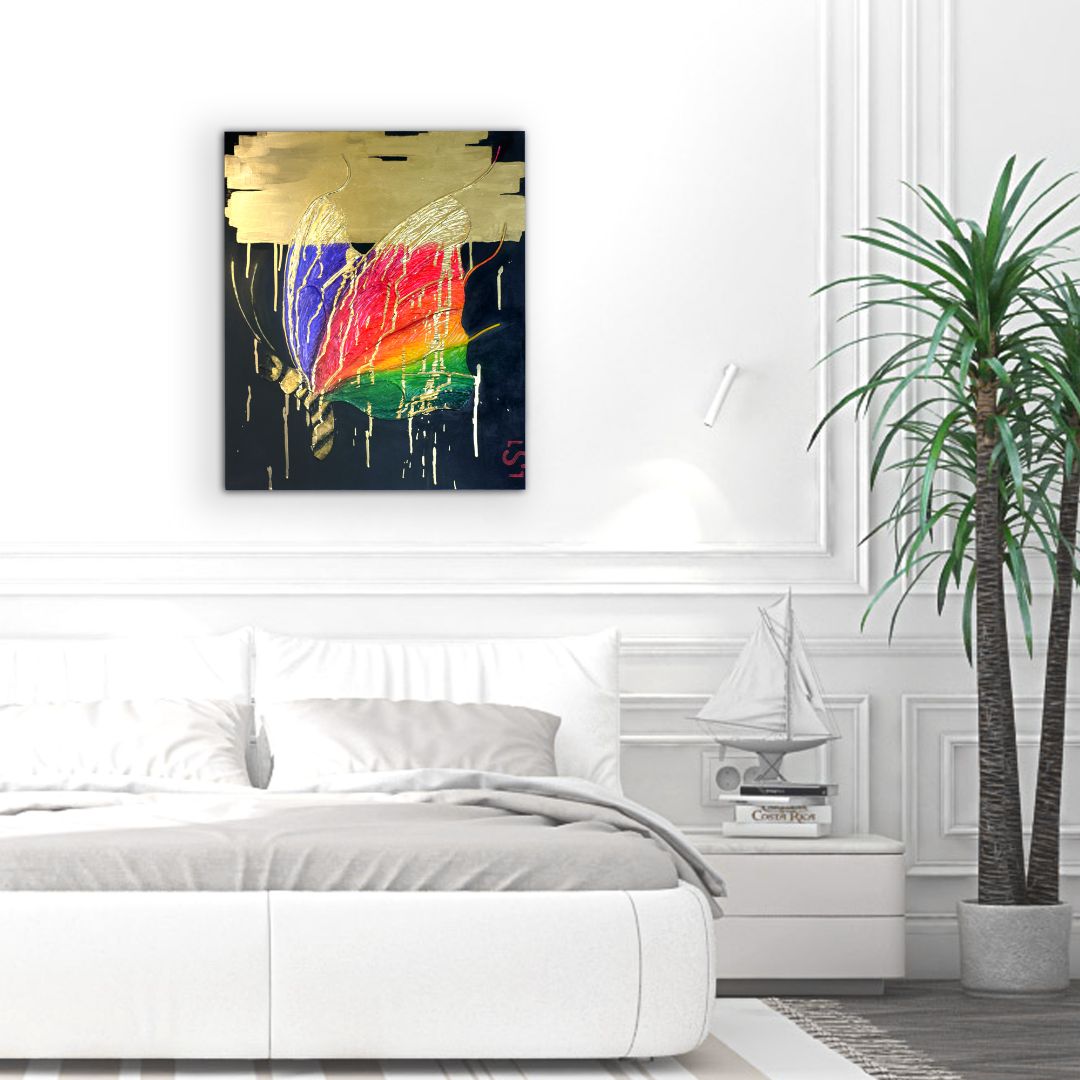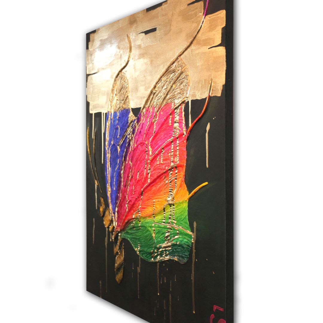 Рассуждая о сюжете картины, можно отметить смелое сочетание таких деталей как: гигантские размеры бабочки, яркий окрас крыльев, небрежные мазки роскошного золота и свободный от второстепенных деталей черный фон. Все эти детали помогают: раскрыть загадку, которую загадал автор, или провести параллели с людьми и событиями твоей жизни, или просто наслаждаться сказочной атмосферой, которую дарит полотно.